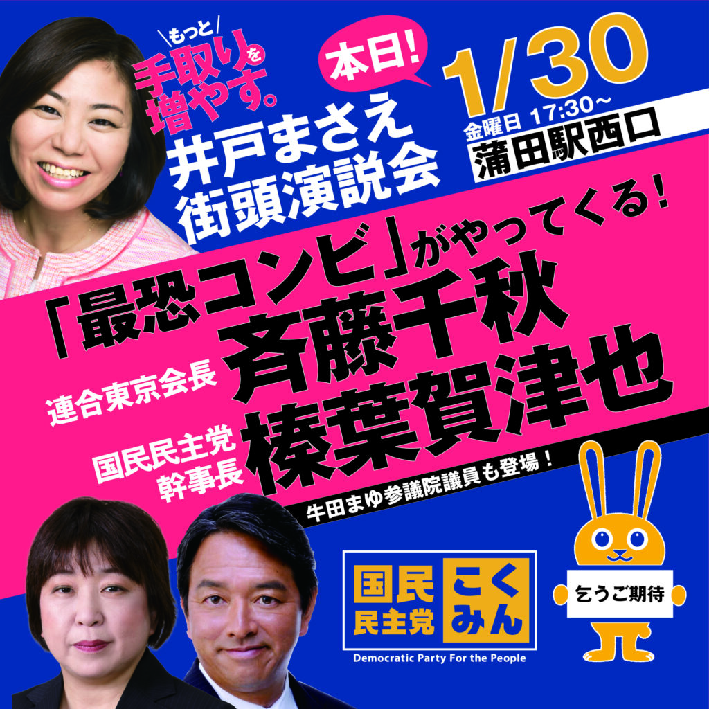 街頭演説会のご案内 講演内容 選挙戦4日目、井戸まさえの街頭演説会のご案内です。皆さまのご参会をお待ちしております。 【応援弁士】 榛葉賀津也 国民民主党幹事長・... -