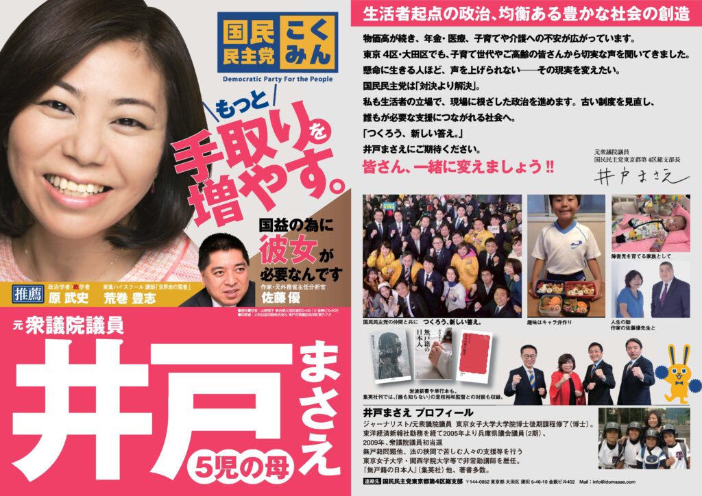 井戸まさえの選挙運動ビラです。 ぜひご覧ください! (注) 選挙運動ビラのデータは、メールによる個別送信のほか、印刷しての配布はできません。 SNSでのシェア・拡散...